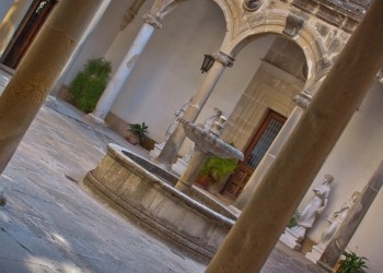 The patio has a staircase similar to that of a convent and is surrounded by five semicircular arches to emphasize the symmetry.