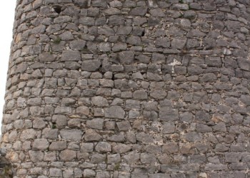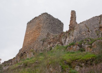 At the highest point of the castle stands a substantial homage tower of Christian construction, with a slightly square floor plan and rounded corners. Perched on the rocky terrain and constructed from masonry, this tower stands at a height of 10 meters and comprises two superimposed vaulted rooms.